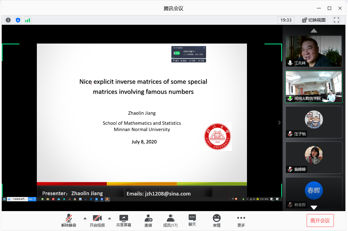 应我院邀请,7月10日上午,临沂大学江兆林教授在腾讯会议作了《Nice explicit inverse matrices of some special matrices involving famous numbers》的报告。相关师生聆听了此次报告,报告由林梦雷院长主持。