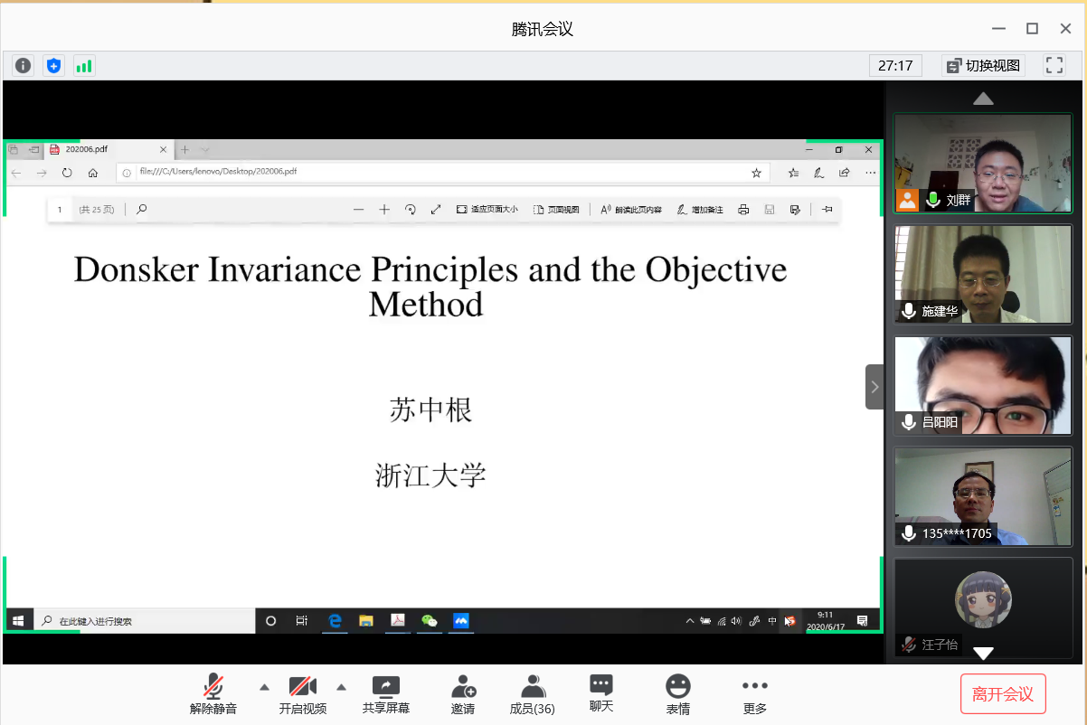 应我院邀请,6月17日上午,浙江大学苏中根教授在腾讯会议作了《On the Donsker Invariance Principles and the Objective Methods》的报告。相关师生聆听了此次报告,报告由刘群副教授主持。