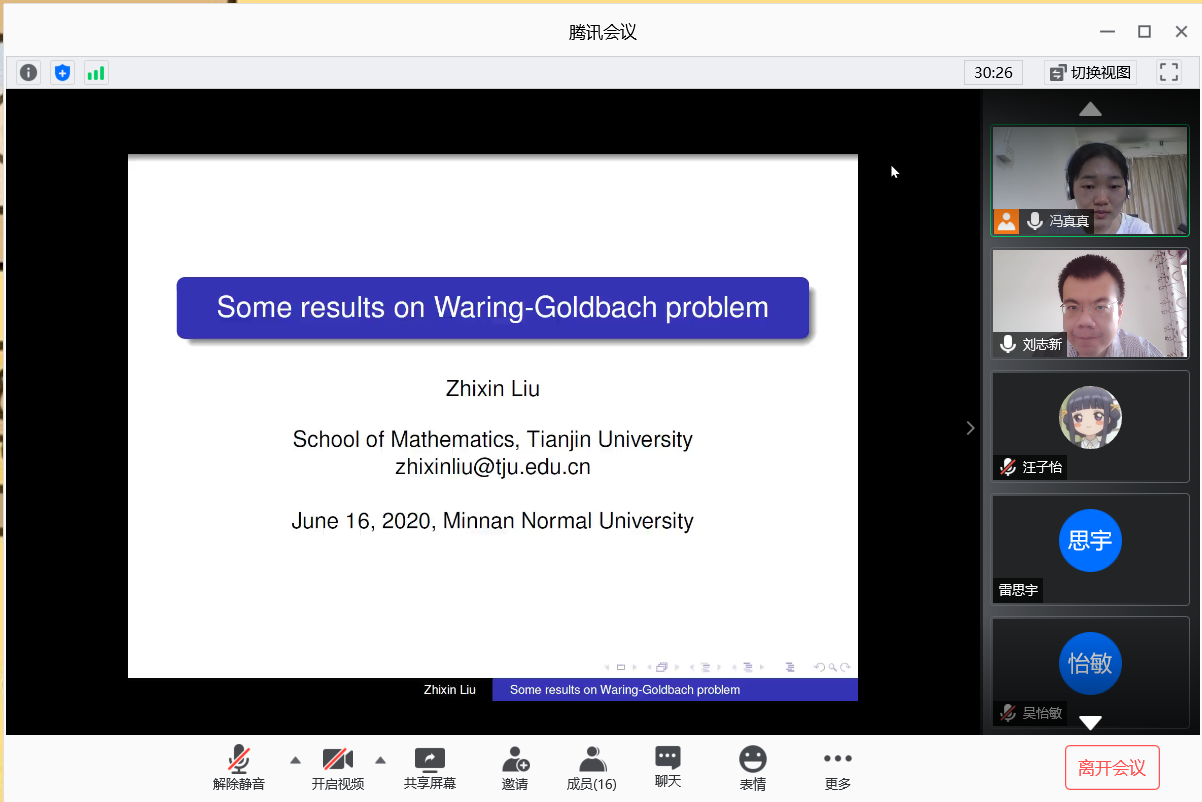 应我院邀请,6月16日上午,天津大学刘志新副教授在腾讯会议作了《SomeresultsonWaring-Goldbachproblem》的报告。相关师生聆听了此次报告,报告由冯真真博士主持。