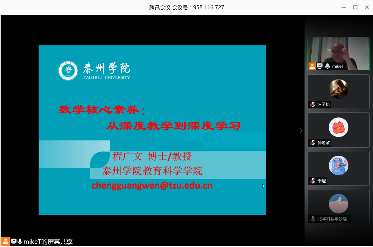 应我院邀请,5月26日晚上,泰州学院程广文教授在腾讯会议作了《数学核心素养培养:从深度教学到深度学习》的报告。相关师生聆听了此次报告,报告由周仕荣教授主持。
