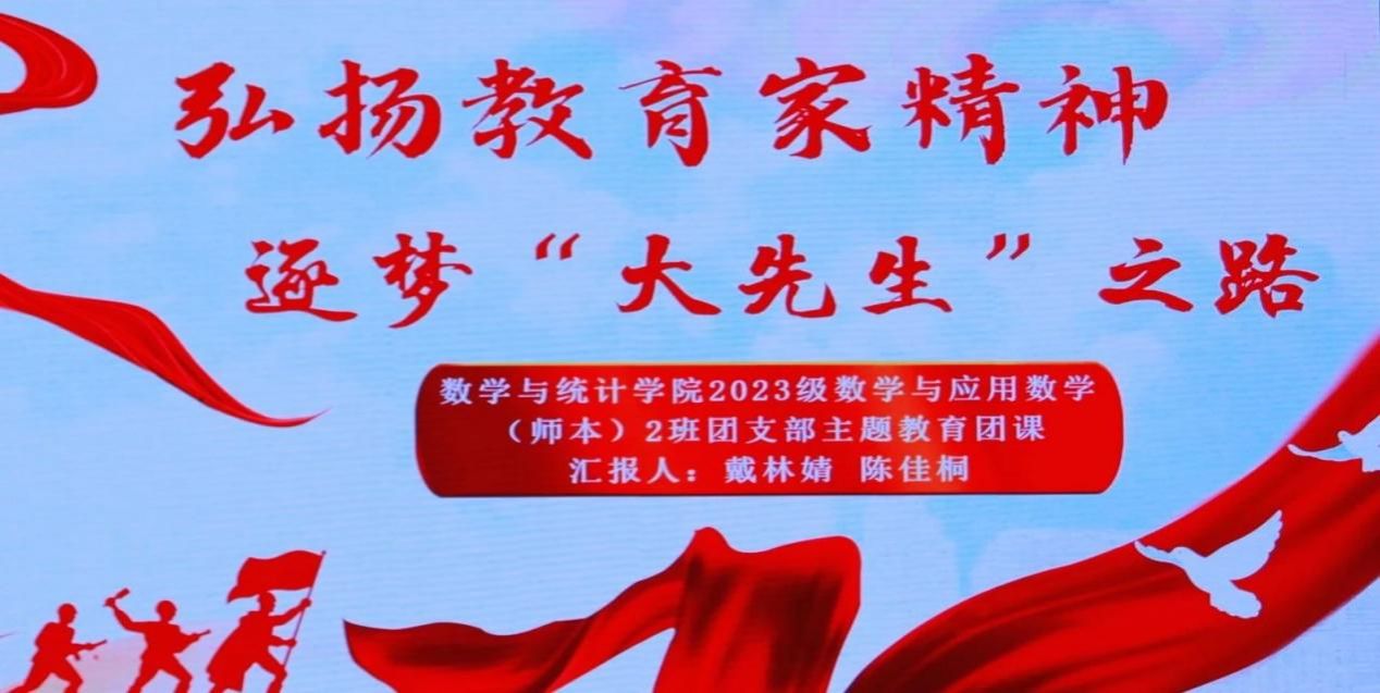 为深入学习今年9月习近平总书记在全国教育大会上强调的教育家精神,深入贯彻党的教育方针,2024年12月9日,ok138cn太阳集团2023级数学与应用数学(师本)2班团支部开展“弘扬教育家精神,逐梦‘大先生’之路”主题团课。校团委副书记李富荣、院团委副书记郑珊,23级辅导员朱旭泽参加了本次主题团日活动。