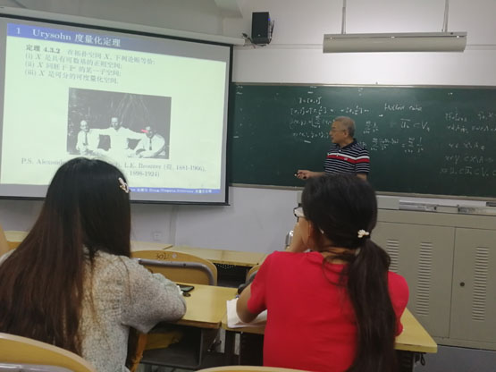 在报告中,林寿教授首先复习可度量化和希尔伯特立方体的定义,为后面讲述的定理做铺垫。接着,详细的证明Urysohn度量化定理,并通过在 “作图”的方式清晰明了的证明了度量空间是仿紧空间。最后,由补助引理引出了Bing-Nagata-Smirnov度量化定理及其相关定理,并对其进行严格的推理证明。报告结束后,在座的老师和学生就相关研究问题进行了探讨和交流。