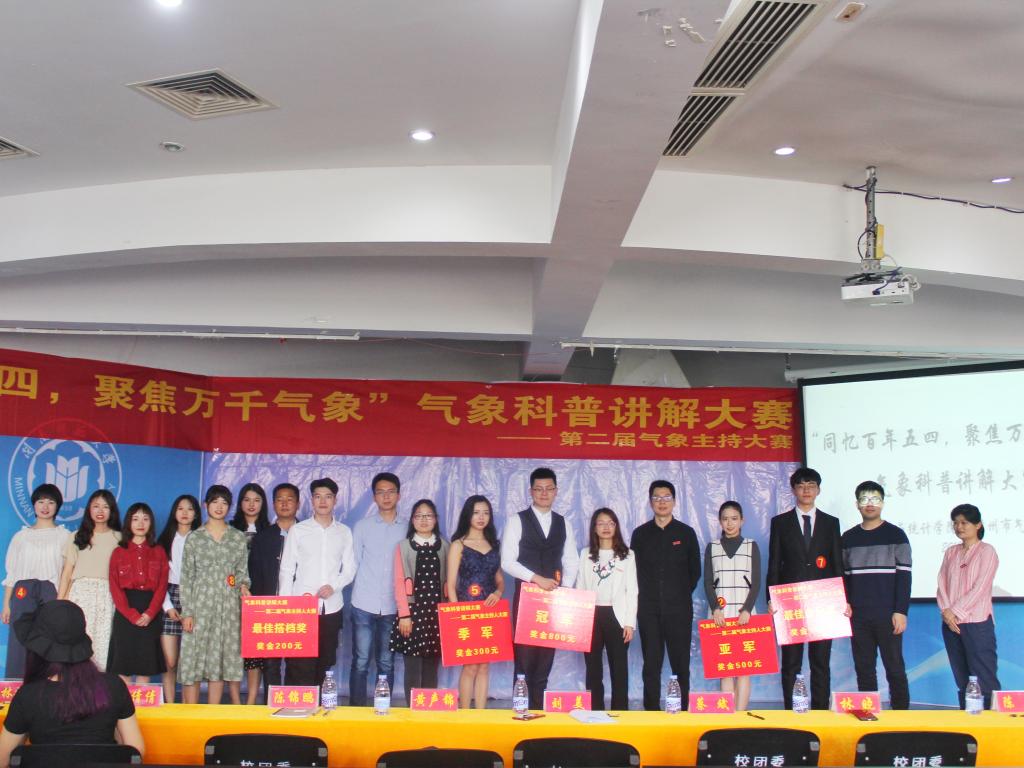 5月9日下午,由漳州市气象局、ok138cn太阳集团团委联合主办,学院艺术团、青年志愿者中心承办的“同忆百年五四,聚焦万千气象”——气象科普讲解大赛暨第二届气象主持人大赛在达理活动中心三楼报告厅圆满落幕。漳州市气象局高级工程师黄声锦、陈锦鹏,气象局科普创新团队负责人刘美,校团委副书记蔡斌老师,学院党委副书记林晓老师、团委书记陈明老师及辅导员出席本次活动。