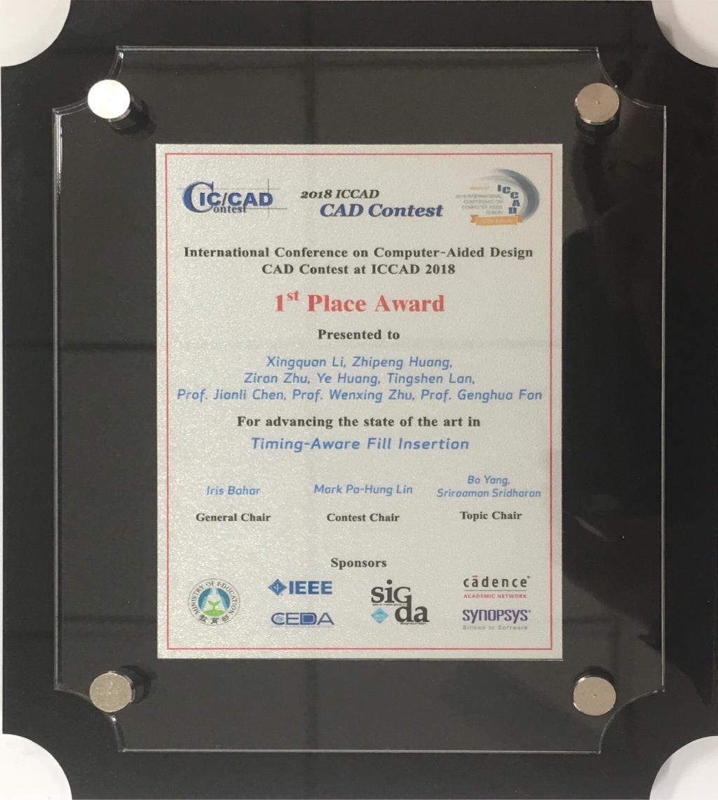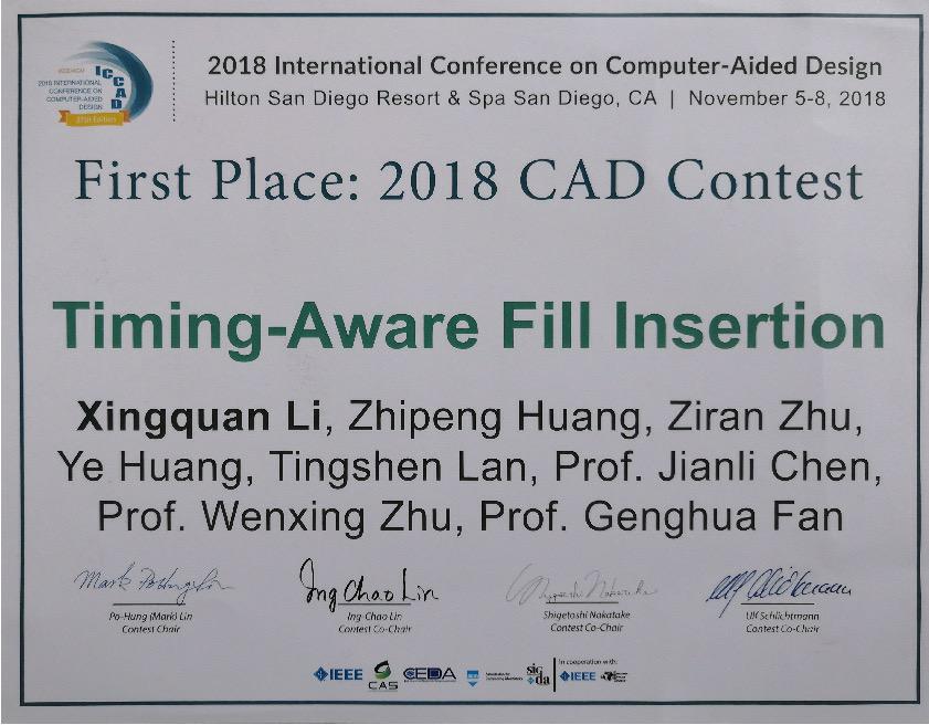 2018年11月5日至8日,第37届国际计算机辅助设计会议在美国加州圣地亚哥召开,会议公布了为期7个多月的ICCAD考虑时延的填充物插入学术竞赛最终结果,由来自OK138太阳集团的李兴权博士与福州大学的团队成员组成的 “Banian”团队夺冠。此次竞赛的第二名至第四名获奖队伍分别是是来自香港中文大学、台湾科技大学、东京大学。