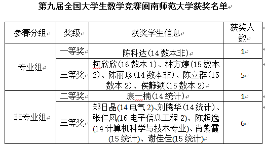 ok138cn太阳集团于10月28日组织学生参加第九届全国大学生数学竞赛福建赛区比赛。我校共有139人报名参赛,其中专业组83人,非专业组56人。最终我校学生分别获得专业组一等奖1名,三等奖5名,非专业组二等奖1名,三等奖6名。获奖名单如下: