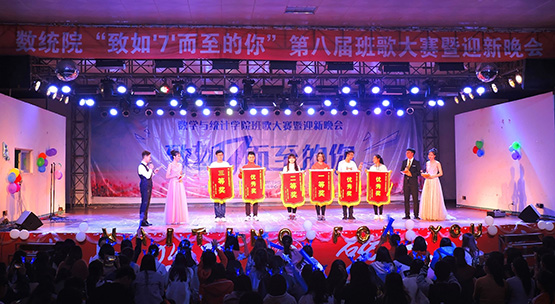 数统学院17级六个班级分别围绕“如‘7’而至”、“进如所‘7’”、“不‘7’而遇”三个主题展开欢乐而又激烈的班歌大赛,经过角逐,最终17数本三班荣获一等奖,17统计班荣获二等奖,17金融班荣获三等奖,17数本一班、数本二班、信息班荣获优秀奖。期间,艺术团小队及16级各班带来《Superlove》、《sexyback》、《大鱼》、《影动青春、数统随行》等精彩表演,不仅展现了数统学院学生的多才多艺,更是引起全场热烈欢呼,将晚会推向高潮。晚会采用支付宝口令红包、微信上墙、扫脸抽奖等新颖的互动方式,让学生们比赛之余能更好的融入晚会气氛。