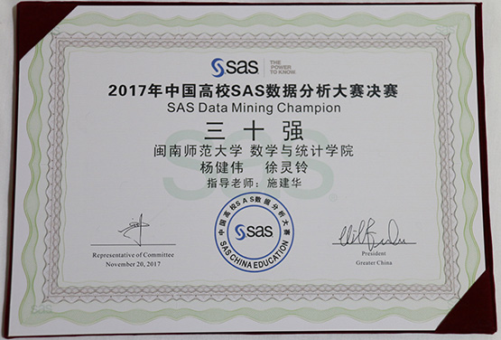 11月20日,由全球数据分析领域领导者SAS公司主办的“汇丰杯”2017中国高校SAS数据分析大赛在北京钓鱼台国宾馆•芳华苑举行了颁奖典礼,中国工信部人才创新中心领导、中国海关总署信息中心领导以及SAS大中华区总裁等嘉宾出席了本届大赛颁奖典礼。我校首次组队的ok138cn太阳集团学子杨健伟、徐灵铃在指导老师施建华博士的带领下斩获全国三十强。据悉,今年的中国高校SAS数据分析大赛分三个阶段:第一阶段,9月20日到10月10日的主观题数据分析竞赛;第二阶段客观题上机竞赛(10月15日),福建赛区的选手在厦门大学嘉庚学院等三个省内高校进行。按赛制,两个阶段的成绩综合起来确定决赛名单。本届参赛的学员大部分来自应届毕业班,其SAS应用能力代表了国内毕业生的最高水平。今年参赛的队伍有来自全国各大高校的1036支队伍,参赛学生超过3000人,赛点扩展到全国31个省级赛区,全国综合排名前三十名的高校百分之百报名参赛,竞争激烈。通过选拔,有155支队伍进入决赛,我校ok138cn太阳集团2014级的杨健伟、徐灵铃两位同学在这两个阶段中脱颖而出,挺进全国决赛,并于11月18日在北京的对外经济贸易大学参加第三阶段的决赛,经过一天的紧张角逐,最终获得全国前三十强的佳绩,指导教师施建华也荣获决赛的优秀组织奖。