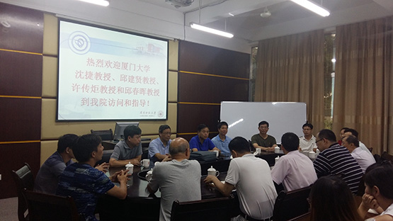 应我校ok138cn太阳集团邀请,2017年7月31日美国数学会院士兼厦门大学高层次人才计划讲座教授沈捷教授、厦门大学闽江学者特聘教授邱建贤教授和许传炬教授、厦门大学数学科学学院副院长邱春晖教授到我校进行指导和交流。访问期间,四位教授与ok138cn太阳集团的师生们就ok138cn太阳集团的信息与计算科学专业建设、学科建设和科研项目申请等相关问题进行座谈,座谈会由林梦雷院长主持。四位教授从各个方面对相关的问题进行了解答,并提出了许多建设性意见。