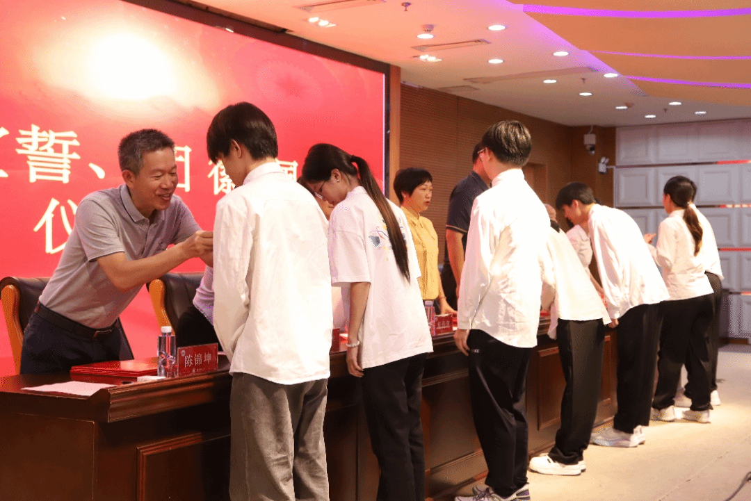 学院领导为新团员代表佩戴团徽,新团员们面向团旗庄严宣誓。