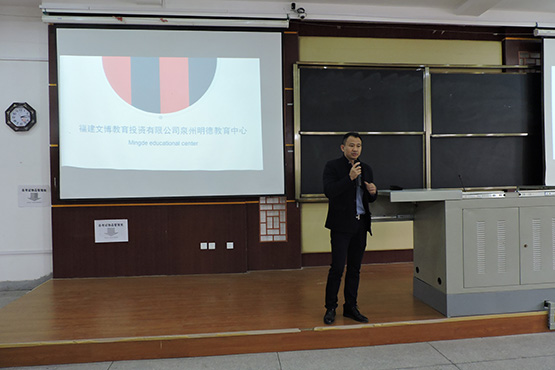 12月15日下午3:00,福建金帝集团旗下教育品牌福建泉州外国语中学、福建泉州明德教育中心专场宣讲会在砺志楼120顺利举行。泉州明德教育中心校长郭文峰、泉州外国语中学招师办公室主任杜增产作为主讲人出席本次宣讲会。ok138cn太阳集团、物理与信息工程学院、化学与环境学院以及外国语学院部分13级学生积极参与。