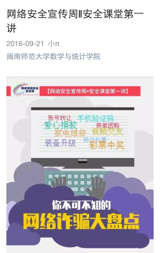 为增强师生的网络安全意识,全面提高网络素养,我院通过微信、微博等线上平台进行宣传。在我院微信公众号平台上推送“安全课堂”,通过对常见网络诈骗的盘点,如虚假票务诈骗、网络兼职诈骗、虚假中奖诈骗等,以图文并茂的方式,更大范围地营造安全上网、依法上网的良好校园氛围,提升广大师生财产及信息的安全意识,让“网络安全为人民,网络安全靠人民”的理念深入人心。