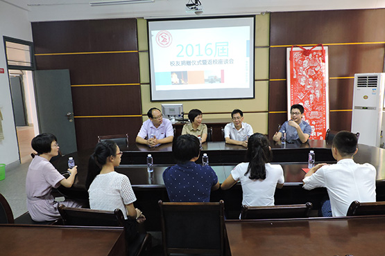 捐赠仪式结束之后,学院领导老师与学生代表举行了座谈。教务处处长林梦雷老师和学院党委副书记陈晶莹老师对16届的同学们表达了感谢,同时了解了同学们毕业后的工作、生活情况,希望同学们努力工作,为母校争光,同时,也希望大家可以常回母校看看。同学们表示,会踏实工作,不辜负学校老师的期望,也会一直关注学院、学校的发展,最后祝老师们教师节快乐。
