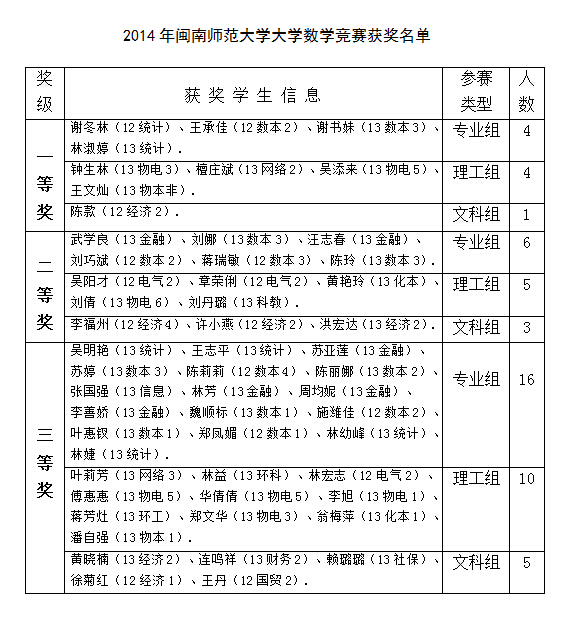 2014年OK138太阳集团大学数学竞赛试卷评阅、评奖工作已于2014年12月2日结束。为严肃竞赛纪律,杜绝不当之风,竞赛组委会决定设立获奖结果争议期,为期7天(2014年12月2-9日)。现将获奖名单征求异议稿公布如下,公开征求广大师生的意见。