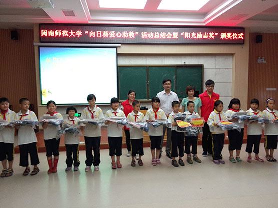 大会总结了“向日葵爱心助教”活动的成果,回顾了志愿者们与闽南师大附小的同学们在助教过程中温暖的点滴。同时,ok138cn太阳集团志愿者中心还特意设立了“阳光励志奖”,用母亲节义卖康乃馨筹到的善款购买文具作为奖品,奖励那些在爱心助教活动中励志的同学。此次获奖的十五名同学都是家庭困难的学生,其中十名是附小红旗班的外来务工子女。韩春茂校长以及少先队总辅导员柯春华老师为各位获奖同学颁奖,并合影留念。