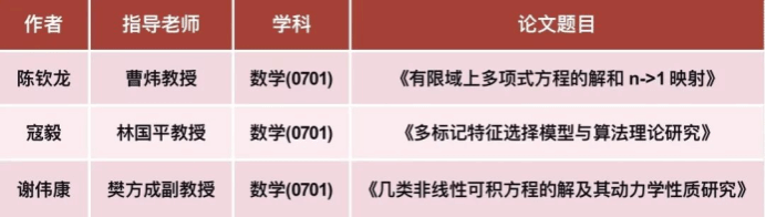 近日福建省学位委员会办公室正式公布2024年优秀硕士学位论文评选结果,其中共有8篇数学(0701)学科硕士学位论文入围。在此次评选中,我院斩获佳绩,共有3篇硕士学位论文成功入选,数量位于全省前列!同时也是我院在此项评选中取得的最佳成绩!此项荣耀充分彰显了我院研究生教育的扎实功底和育人成效,也展现了学院在学术研究与太阳集团方面的持续进步。本次荣获省级优秀硕士学位论文的名单如下: