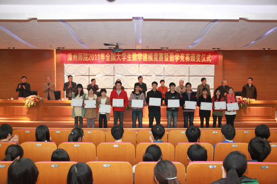 2012年3月8日下午,在逸夫楼图书馆五楼报告厅,数学与信息科学系举行2011年全国大学生数学建模竞赛暨数学竞赛颁奖仪式,出席本次仪式的领导有院党委委员、副院长肖庆伟教授,学生处处长林静华研究员,教务处处长黄金明教授、副处长黄晓农副教授,院团委副书记郑炎山,计算机科学与工程系党总支书记、副主任林梦雷副教授,物理与电子信息工程系主任周小方教授,数学与信息科学系主任李克典教授,系党总支书记徐志怀教授,副主任陈跃辉副教授,同时参加仪式的还有竞赛指导老师、辅导员、获奖学生及各系学生代表共计350人,仪式由数学系党总支徐志怀书记主持。