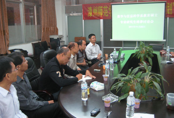 为了推进教育硕士专业研究生教育工作,发挥研究生培养方案对研究生培养工作的指导作用, 2011年11月20日,数学与信息科学系教育硕士专业研究生培养研讨会在砺志楼114举行。出席研讨会的有系主任李克典教授、副主任蔡建平教授,教育硕士导师周仕荣副教授、林梦雷副教授,兼职导师漳州普教室许耀德老师、漳州一中李两火、林新建老师、厦门五显中学陈长兴老师,以及2011级数学学科教育专业的全体研究生。
