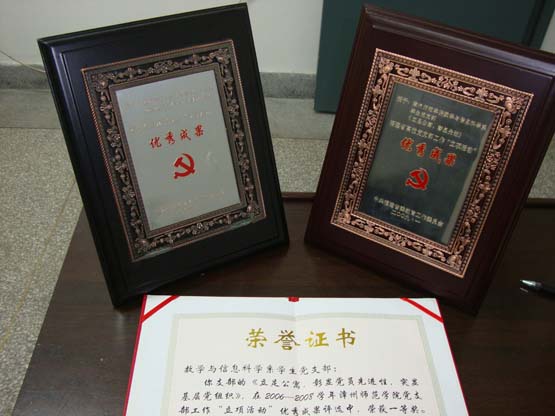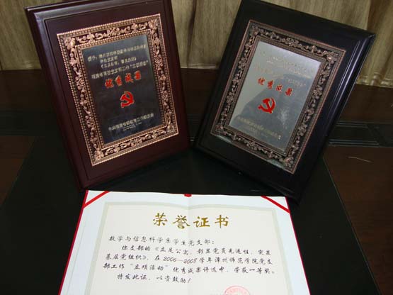 根据省委教育工委关于高校党支部工作“立项活动”的部署和要求,数学系结合本系学生的具体情况,于2006—2008学年积极组织开展以《立足公寓,彰显党员先进性,突显基层党组织》的学生党支部立项活动。此项活动取得了良好成效,不仅增强了本系学生党员的凝聚力、创造力和战斗力,而且更好地服务同学,真正做到了党员“为人民服务”的宗旨。在2009年1月福建省高校党支部工作“立项活动”评选中,该项目被中共福建省委教育工作委员会授予优秀成果奖。此次获奖是继2004年11月数学系学生党支部《两地高校学生党员携手社会实践,一次党员教育形式和组织模式的创新》在福建省高校党支部“立项活动”获得优秀成果奖后再次获此殊荣,并于2009年3月被中共漳州师范学院委员会组织部评为我校党支部工作“立项活动”一等奖。
