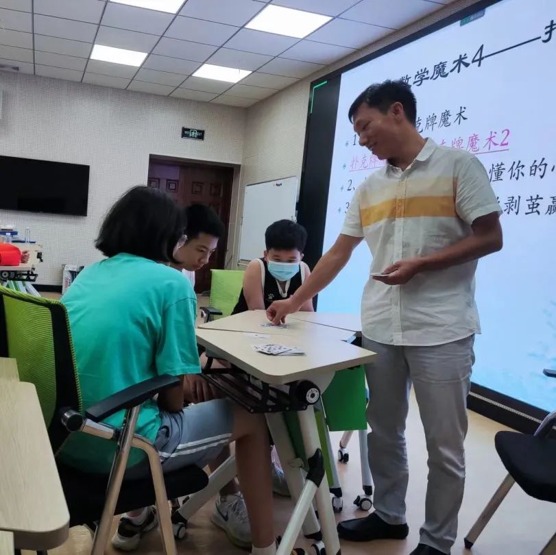 下午,袁正中老师带领大家探索一个新的数学天地--数学魔术。讲座伊始,袁老师告诉学员们,数学的学习比较枯燥、抽象,我们要善于发现数学美、好玩的一面。而魔术中的数学,就是数学中“好玩”的一面。然后,袁老师向学员们展示了四个“数学魔术”:骰子、预言剩下的东西、数字魔宫、扑克牌。在本节充满“魔力”的课堂中,学员们在观察魔术和解密魔术的过程同时,提高对数学知识学习的热情。