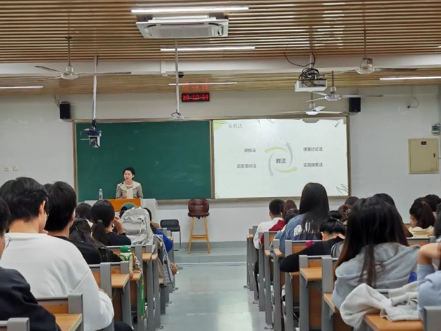 分享会上,张丽莹同学围绕比赛流程、试讲过程、备课过程、教学设计和注意事项五个方面展开讲述。她首先指出,片段教学包括导入、新授、小结三个部分,在授课期间要注重对学生的引导,合理设置问题串,提高学生的参与感,突出学生的课堂主体地位;其次,她结合自身经验,强调在设计教学时需进行多次磨课,要用旁观者的视角看问题,在发现不足后及时改进,以此提升教学质量;随后,她还着重提出了几个注意点:检查教具与设备、礼貌对待评委老师、保持良好教态等。
