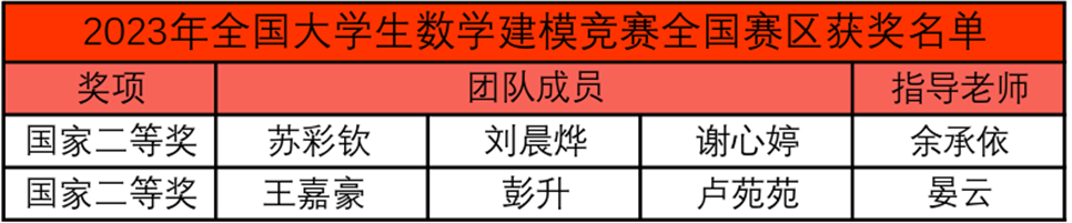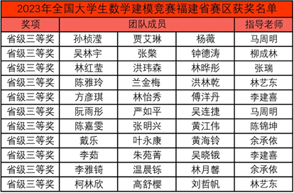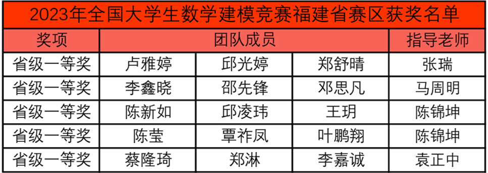 近日,2023年“高教社杯”全国大学生数学建模竞赛成绩揭晓,我校学子在数学建模竞赛中取得佳绩。此次比赛中,我校共有26支队伍获奖,其中全国二等奖2项,福建省一等奖5项,二等奖8项,三等奖11项。具体获奖情况如下所示: