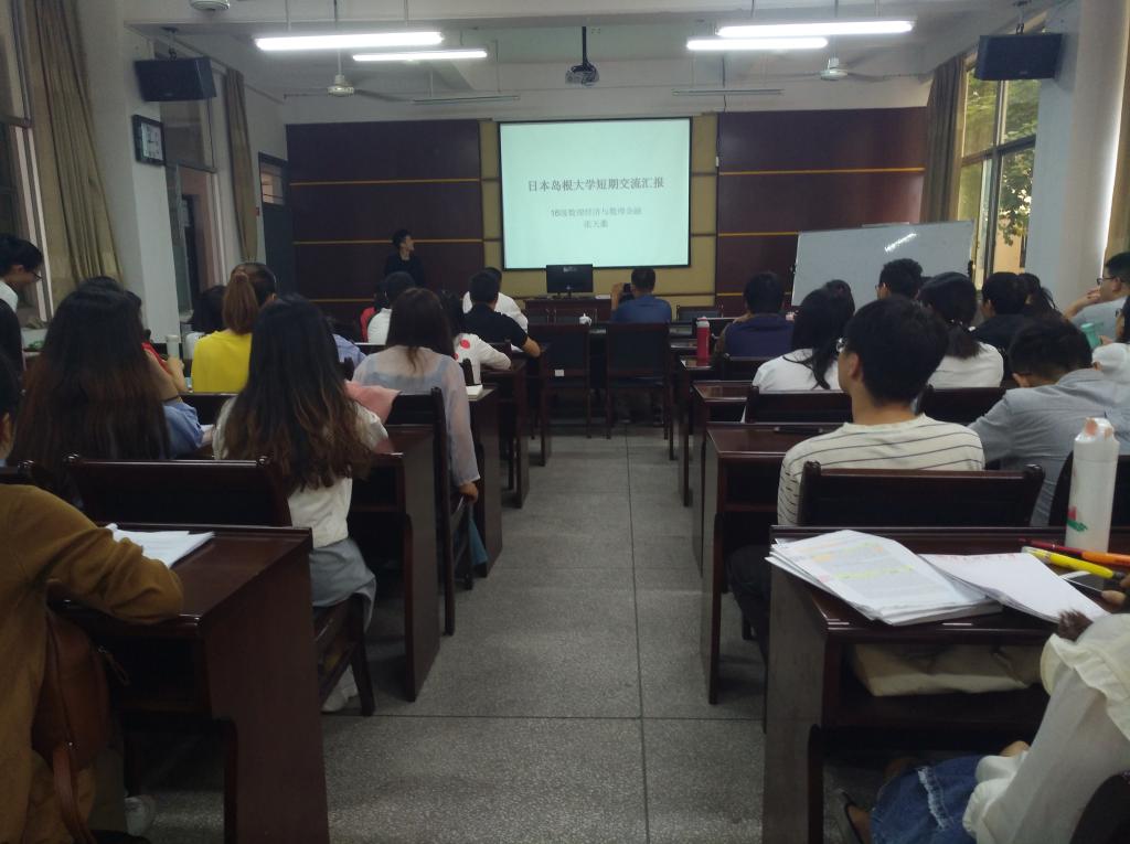 2018年10月18日下午,我院2016级研究生张天衢、李嘉达在砺志楼114分享日本岛根大学为期半年的访学交流体会。林福财教授、郭宝霖教授以及全体研究生出席了会议,会议由研究生会宣传部长彭圆红主持。