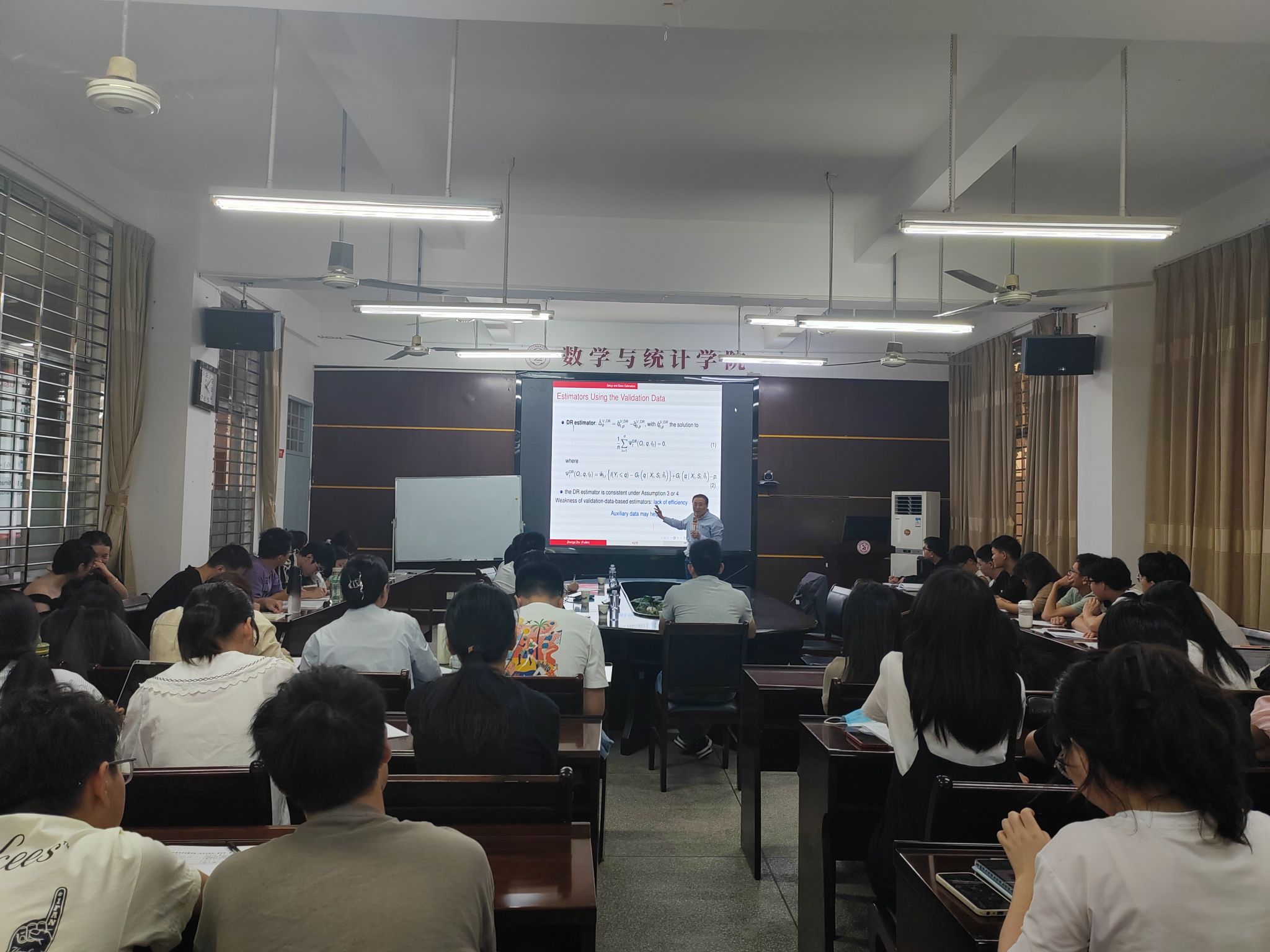 报告中,朱仲义教授主要介绍了一种融合分位数治疗效果估计器(FQTE),该估计器基于双鲁棒估计函数整合了来自两个数据集的信息,是渐近正态的,并且比仅使用验证数据的初始QTE估计器更有效。通过建立相关估计量的渐近线性形式,提供了方便的协方差估计方法。最后,介绍了通过仿真结果证明了FQTE的经验有效性和提高的效率。报告结束后,在座的师生就相关研究问题进行了探讨和交流。