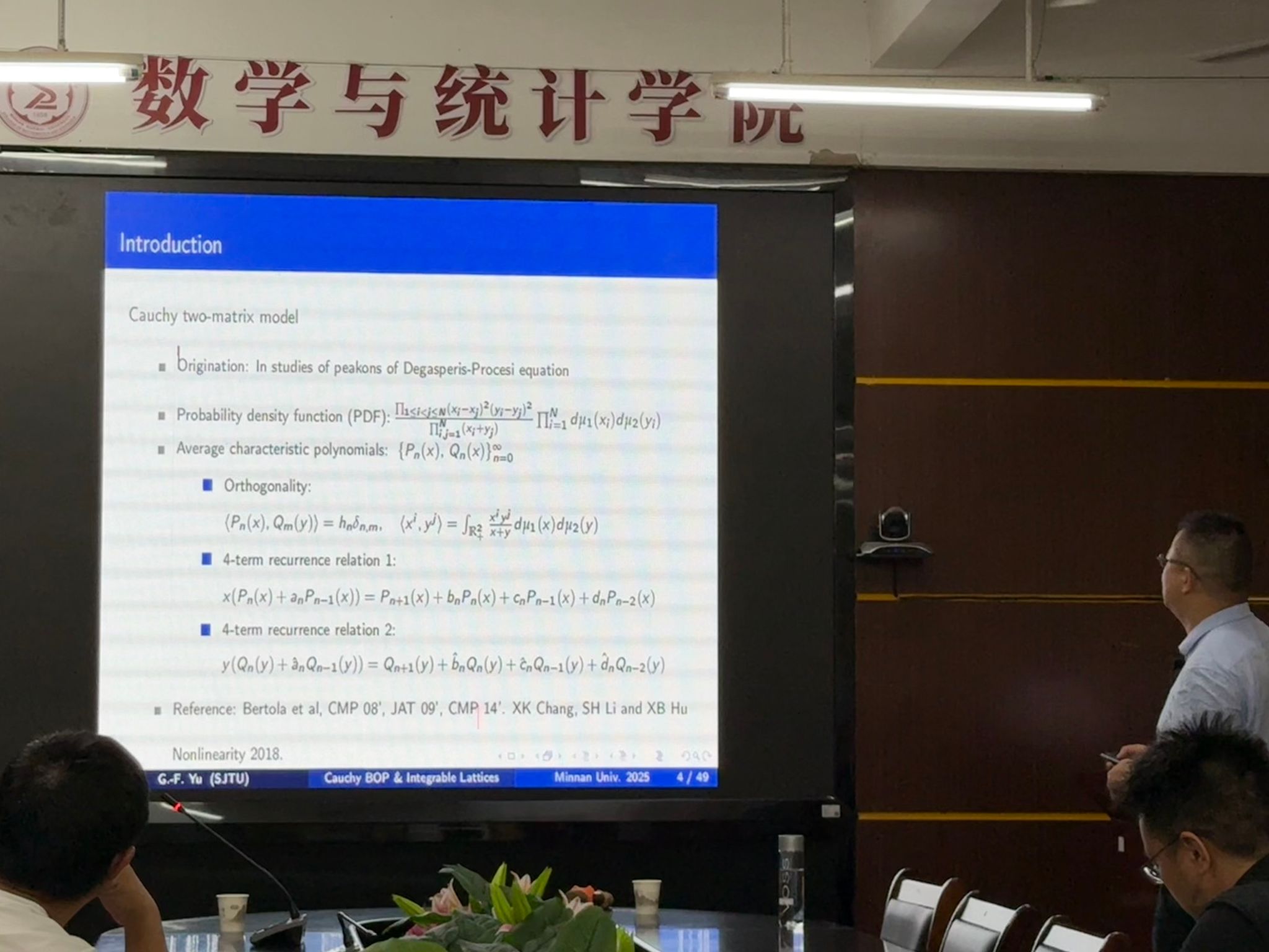 在讲座中,虞国富教授首先为听众介绍了柯西双正交多项式的数学定义与基本性质,通过解析其正交关系与递推公式,揭示了这类多项式与可积系统之间深刻的内在联系。从可积系统的Lax对表述出发,虞教授详细阐述了柯西双正交多项式如何在构建可积模型的代数结构中发挥关键作用,展示了其在非线性偏微分方程精确解构造方面的重要应用价值。随后,虞教授将研究视角拓展到柯西双正交多项式的双参数推广形式。通过引入两个额外的参数,虞教授及其研究团队系统探讨了这种推广形式在数学结构和物理意义上的新特性,并在此基础上,进一步介绍了可积格的相关理论,分析了双参数柯西双正交多项式与可积格之间的相互作用机制,包括如何通过格点方程的形式展现多项式的对称性与可积性。最后,虞教授指出,其团队聚焦于柯西-雅可比双正交多项式,通过深入研究其离散谱变换,成功构建了与之对应的离散可积系统。在这一过程中,研究团队采用代数几何方法与算子理论相结合的技术手段,严格推导了离散谱变换的具体形式和性质。结果表明,柯西-雅可比双正交多项式的归一化因子与离散CKP方程的tau函数存在着紧密的对应关系,该归一化因子恰好充当了离散CKP方程的tau函数,这一发现为进一步研究离散可积系统的代数结构和动力学行为提供了全新的视角和有力的工具。