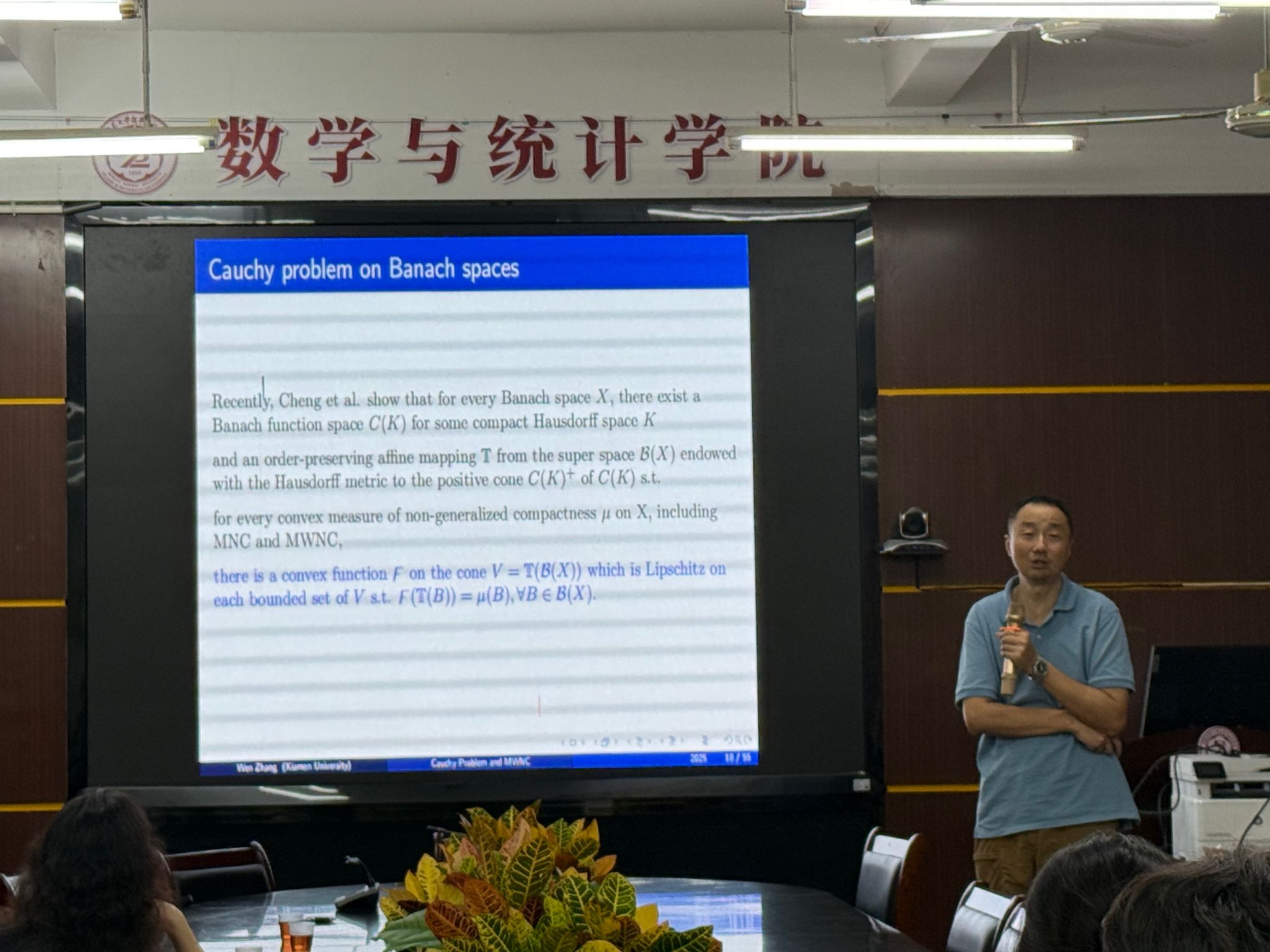 讲座中,张文教授以抽象柯西初值问题为核心切入点,系统阐释Banach空间理论在该问题研究中的关键价值。他重点介绍了弱非紧性测度与Tychonoff不动点定理两大核心工具的应用逻辑——通过将弱非紧性测度的分析特性与Tychonoff不动点定理的存在性证明优势相结合,在弱拓扑框架下的特定假设条件下,成功证明了任意Banach空间中抽象柯西初值问题在给定区间上解的存在性。这一研究思路不仅为抽象柯西初值问题的求解提供了新的理论路径,更拓展了Banach空间理论在微分方程领域的应用边界。