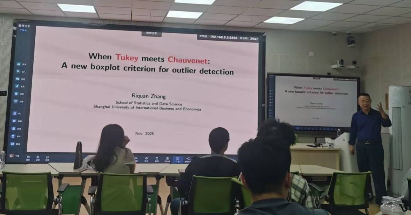 应我院邀请,11月13日下午,上海对外经贸大学张日权教授在砺志楼131作了题为《When Tukey meets Chauvenet: A new boxplot criterion for outlier detection(1-2)》的讲座。相关师生聆听了此次讲座,讲座由李气芳老师主持。