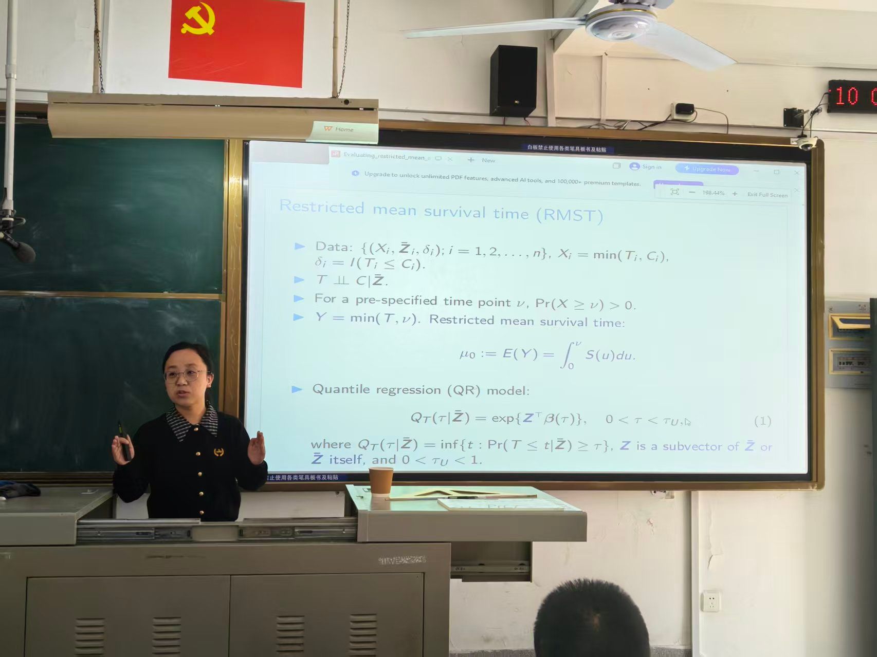 讲座中,马慧娟副教授聚焦生存数据分析领域的核心问题,重点阐释了受限平均生存时间(RMST)与删失分位数回归的创新性关联。她指出,RMST作为具有临床可解释性的重要总结指标,近年来在生存分析领域备受关注,而删失分位数回归是分析生存数据的有效策略,但两者间的关联机制此前尚未明确。