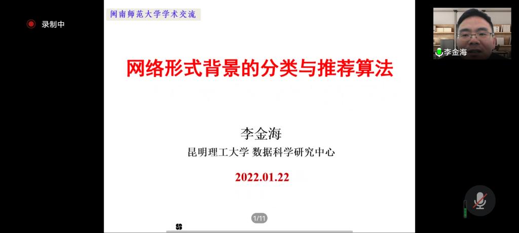 应我院邀请,1月22日上午,昆明理工大学李金海教授在腾讯会议作了题为《网络形式背景的分类与推荐算法》的报告。相关师生聆听了此次报告,报告由李进金教授主持。