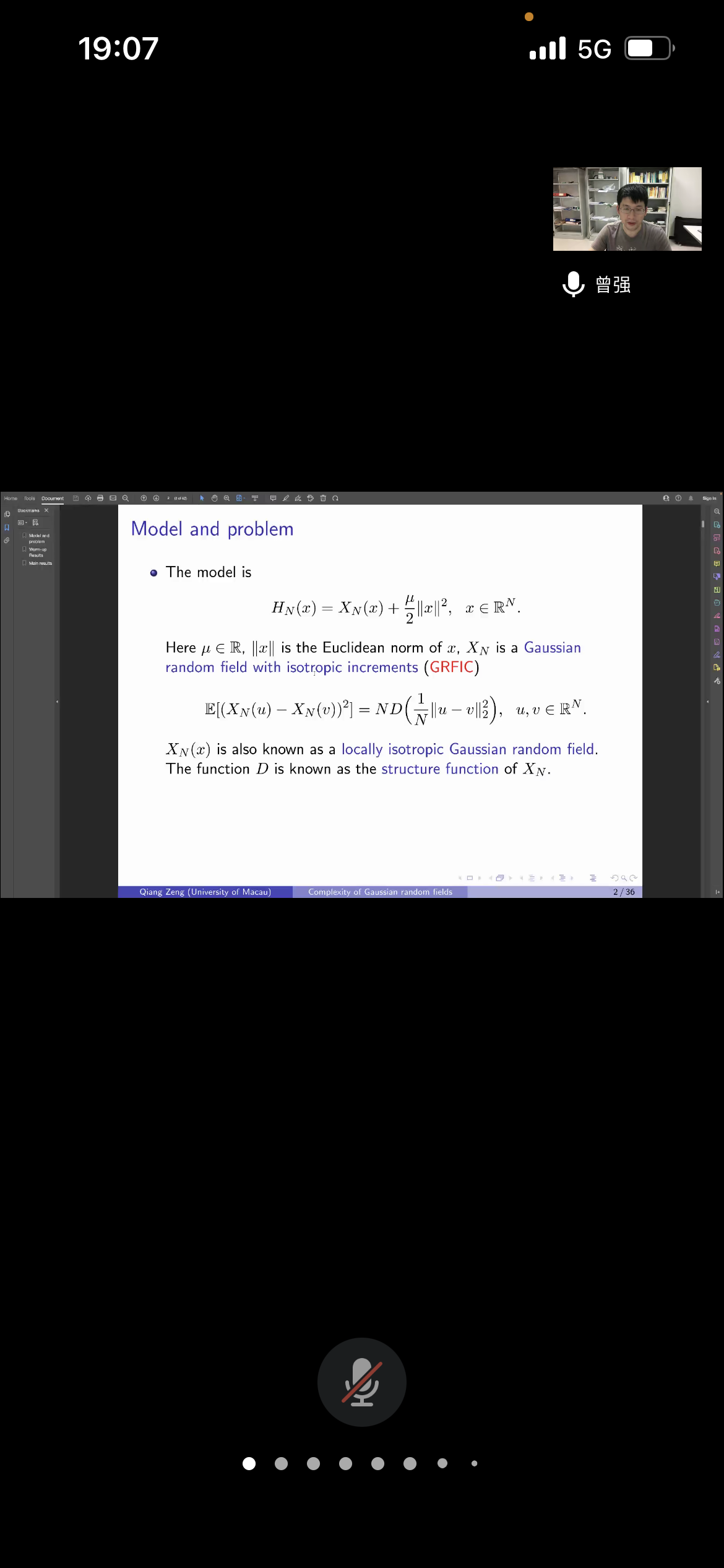 应我院邀请,5月11日晚上,澳门大学曾强副教授在腾讯会议作了题为《Complexity of high dimensional Gaussian random fields with isotropic increments》的报告。相关师生聆听了此次报告,报告由刘群老师主持。