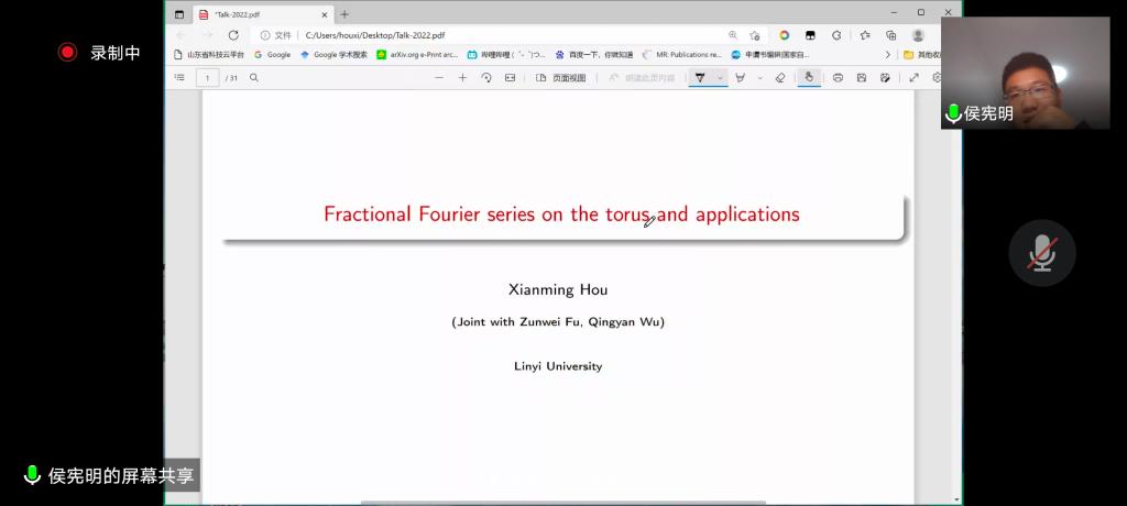 应我院邀请,5月14日晚上,临沂大学侯宪明博士在腾讯会议作了题为《Fractional Fourier series on the torus and application》的报告。相关师生聆听了此次报告,报告由温泳铭老师主持。