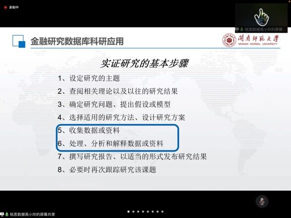 应我院邀请,5月20日早上,北京聚源锐思数据科技有限公司高小玲经理在腾讯会议作了题为《大数据视角下的实证研究—基于RESSET锐思数据库》的报告。相关师生聆听了此次报告,报告由施建华老师主持。