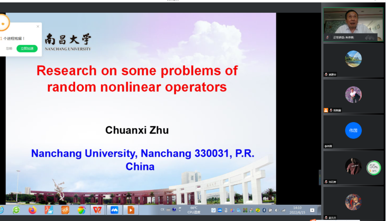应我院邀请,6月15日早上,南昌大学朱传喜教授在腾讯会议作了题为《Research on some problems of random nonlinear operators关于随机非线性算子若干问题的研究》的报告。相关师生聆听了此次报告,报告由施建华老师主持。
