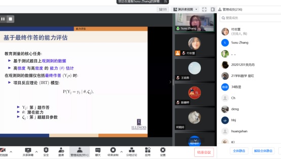 应我院邀请,7月20日早上,美国伊利诺伊大学香槟分校张苏苏助理教授在腾讯会议作了题为《基于过程性数据的能力评估(Accurate Assessment via Process Data)》的报告。相关师生聆听了此次报告,报告由付志慧老师主持。