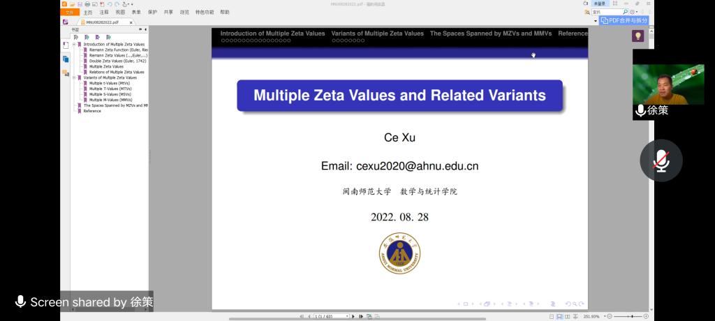 应我院邀请,8月28日下午,安徽师范大学徐策副教授在腾讯会议作了题为《Multiple Zeta Values and Related Variants》的报告。相关师生聆听了此次报告,报告由曹炜老师主持。