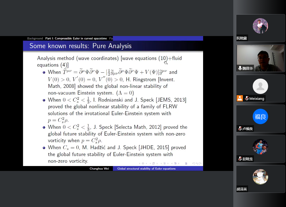 应我院邀请,9月26日早上,浙江理工大学魏昌华副教授在腾讯会议作了题为《The globally smooth solution to a class of compressible Euler equations》的报告。相关师生聆听了此次报告,报告由黄梅香老师主持。