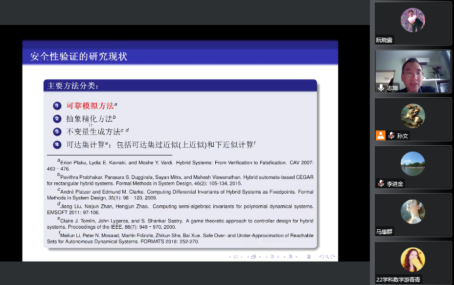 应我院邀请,10月25日下午,北京航空航天大学佘志坤教授在腾讯会议作了题为《基于可达集上下近似的混成系统安全性验证研究》的报告。相关师生聆听了此次报告,报告由李进金老师主持。