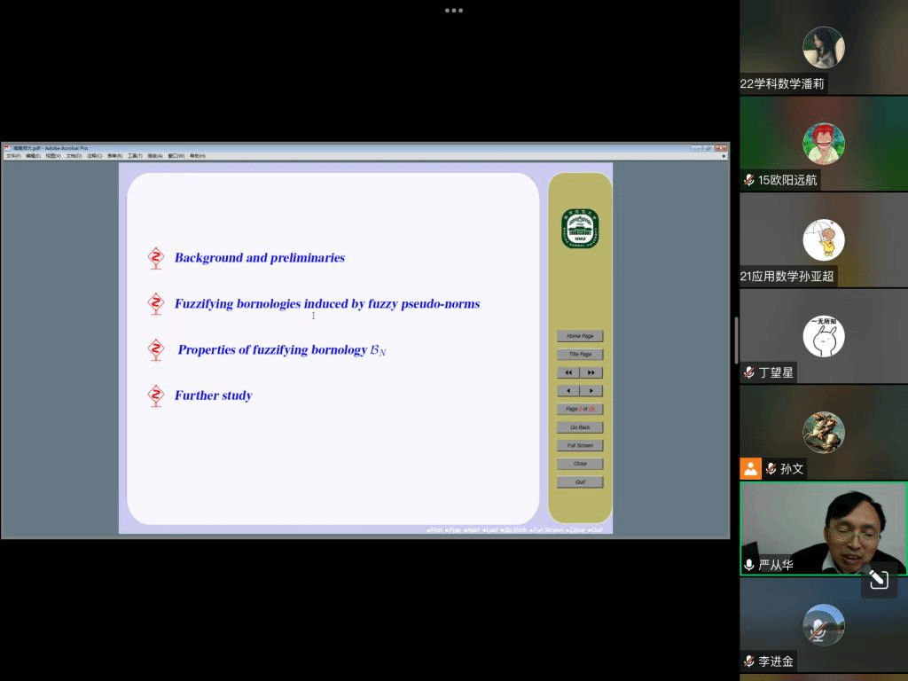 应我院邀请,10月25日下午,南京师范大学严从华教授在腾讯会议作了题为《Fuzzifying bornologies induced by fuzzy pseudo-norms》的报告。相关师生聆听了此次报告,报告由孙文老师主持。