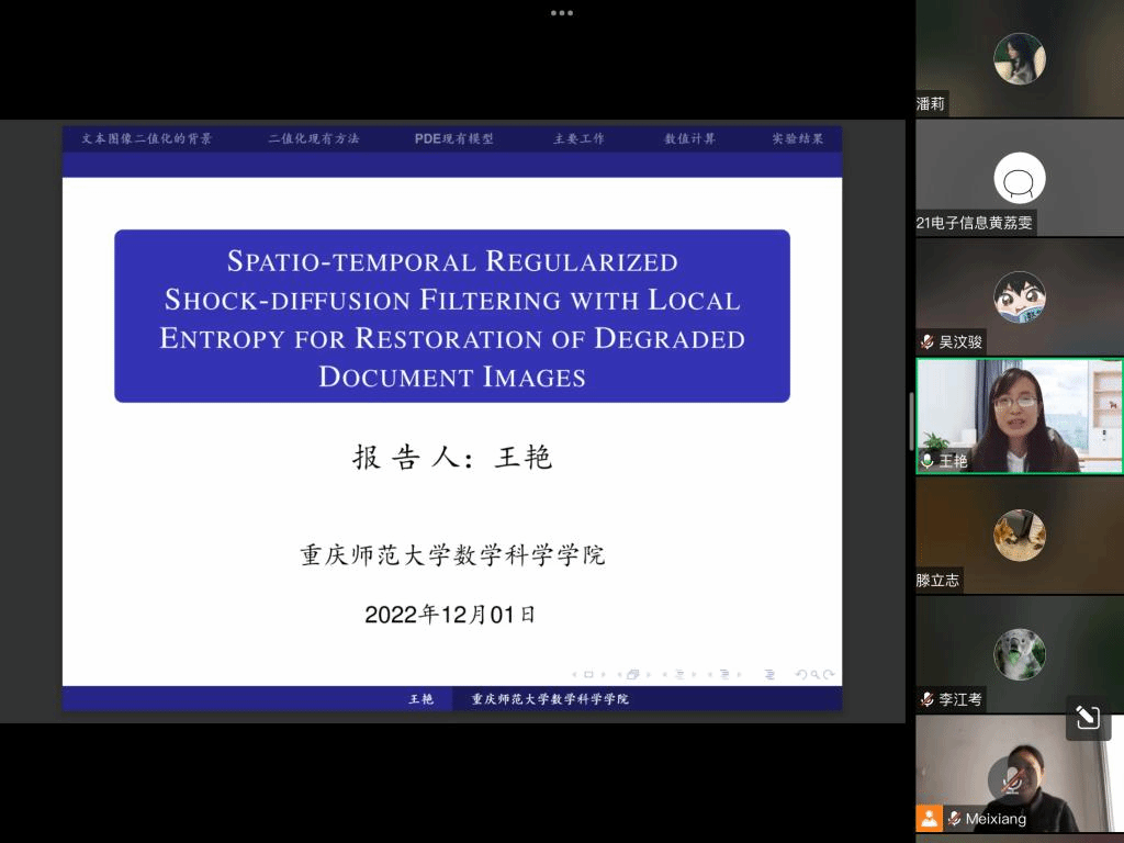 应我院邀请,12月1日下午,重庆师范大学王艳教授在腾讯会议作了题为《Spatio-temporal regularized shock-diffusion filtering with local entropy for restoration of degraded document images》的报告。相关师生聆听了此次报告,报告由黄梅香老师主持。