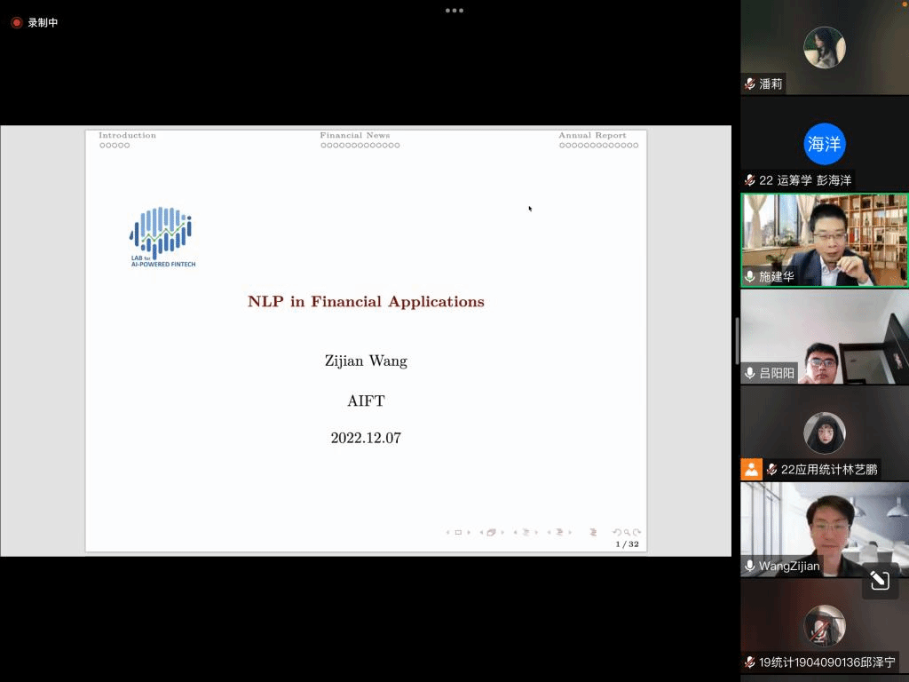 应我院邀请,12月7日下午,香港人工智能金融科技实验室研究员王子剑在腾讯会议作了题为《自然语言处理在金融中的应用》的报告。相关师生聆听了此次报告,报告由施建华和吕阳阳老师主持。