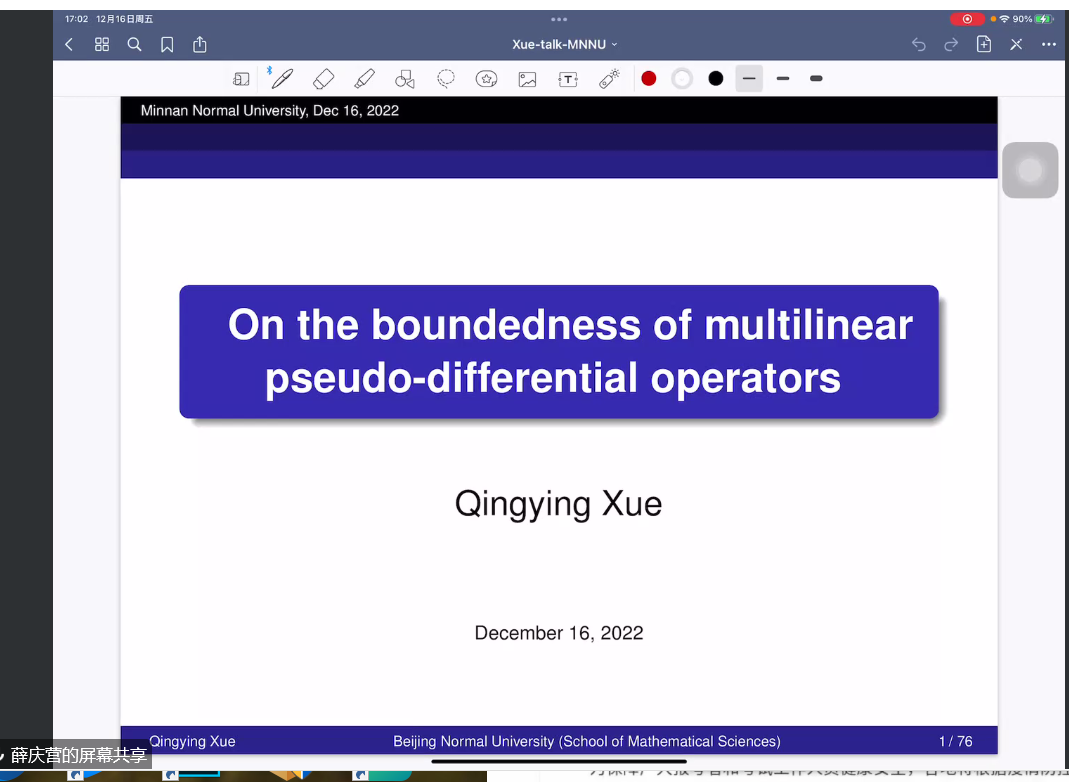 应我院邀请,12月16日下午,北京师范大学薛庆营教授在腾讯会议作了题为《On the boundedness of multilinear pseudo-differential operators》的报告。相关师生聆听了此次报告,报告由温泳铭老师主持。