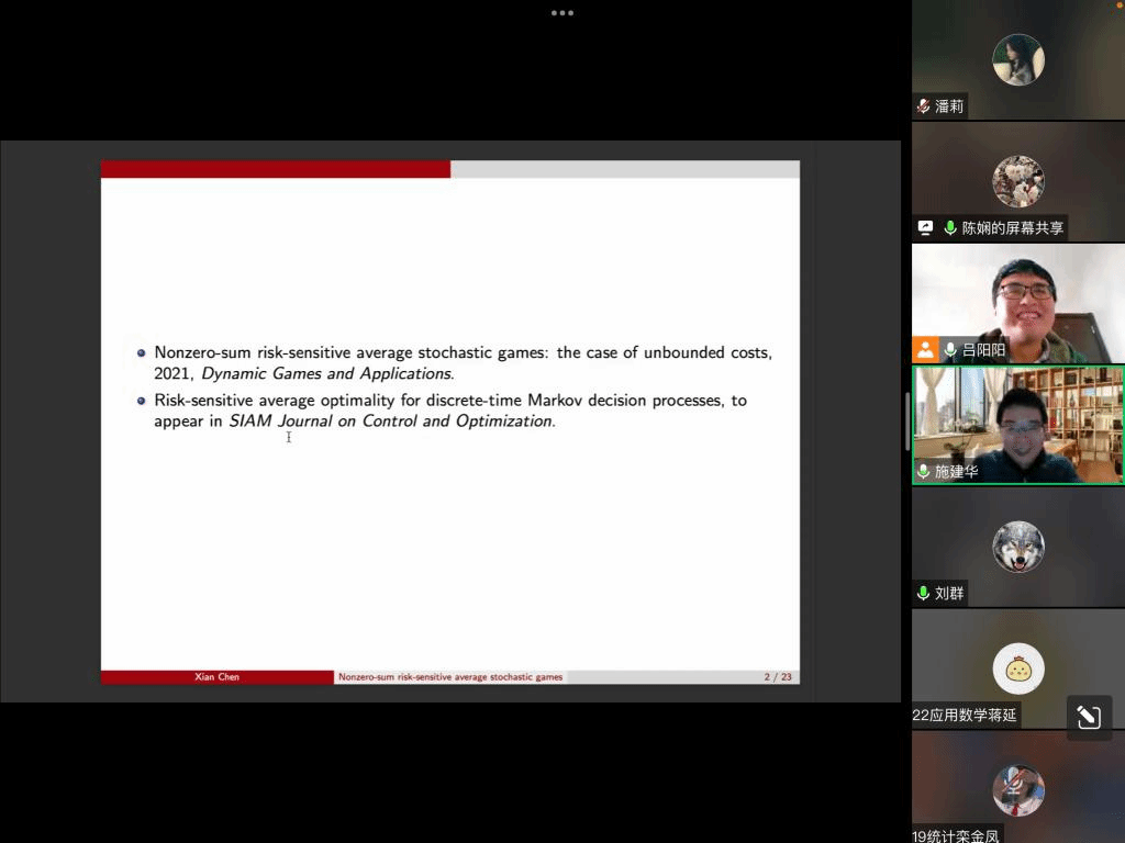 应我院邀请,12月27日下午,厦门大学陈娴副教授在腾讯会议作了题为《Nonzero-sum Risk-Sensitive Average Stochastic Games》的报告。相关师生聆听了此次报告,报告由吕阳阳老师主持。