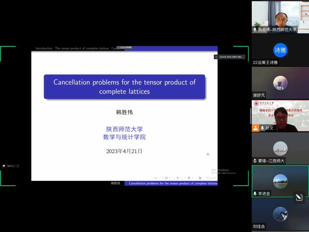 应我院邀请,4月21日下午,陕西师范大学韩胜伟教授在腾讯会议作了题为《Cancellation problems for the tensor product of complete lattices》的报告。相关师生聆听了此次报告,报告由孙文老师主持。