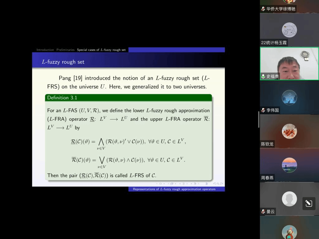 应我院邀请,4月22日上午,北京理工大学史福贵教授在腾讯会议作了题为《Representations of L-fuzzy rough approximation operators》的报告。相关师生聆听了此次报告,报告由孙文老师主持。