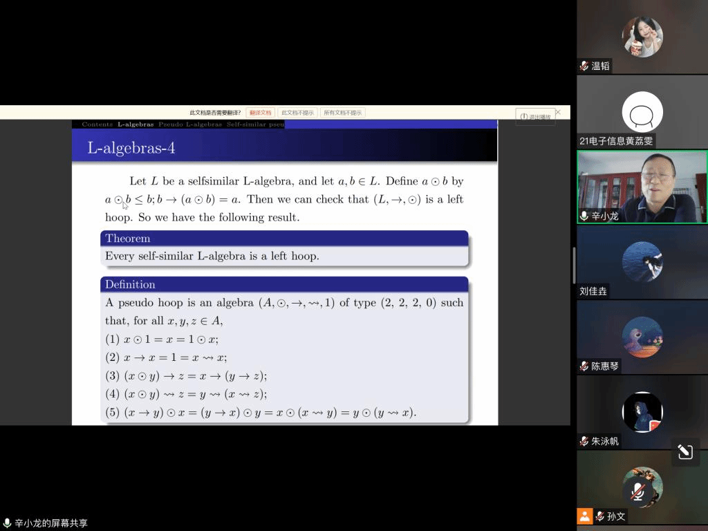 应我院邀请,5月18日下午,西北大学辛小龙教授在腾讯会议作了题为《The unified model of quantum logic and fuzzy logic-pseudo L-algebras》的报告。相关师生聆听了此次报告,报告由李进金老师主持。