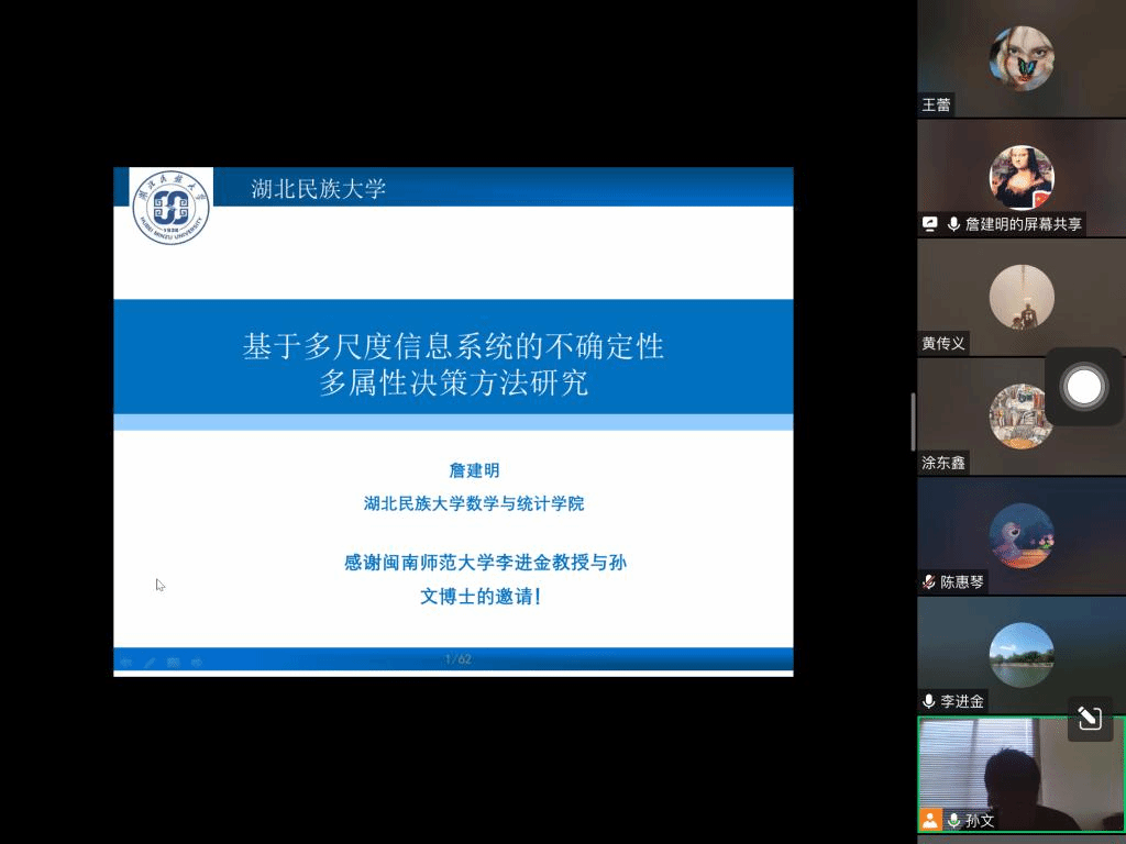应我院邀请,6月3日上午,湖北民族大学詹建明教授在腾讯会议作了题为《基于多尺度信息系统的不确定性多属性决策方法研究》的报告。相关师生聆听了此次报告,报告由孙文老师主持。