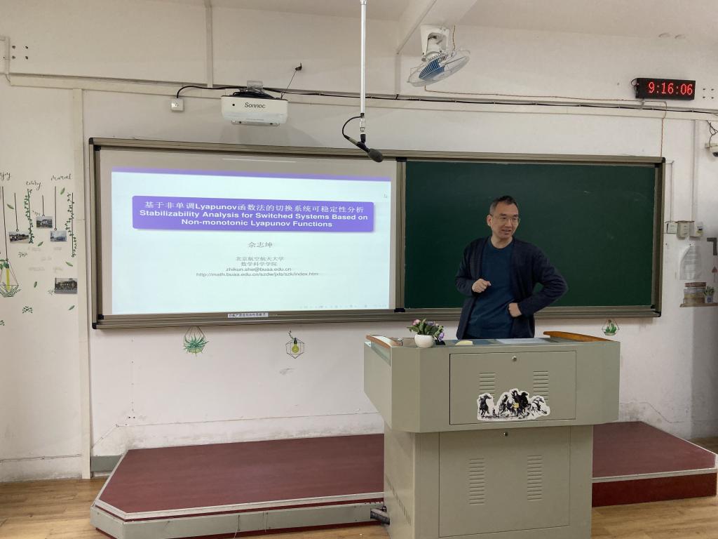 报告中,佘志坤教授指出切换系统是由若干连续或离散的子系统以及一个决定如何在子系统间切换的规则组成的混成系统。切换系统分析与综合极其复杂,例如:切换系统稳定性分析是一不可判定问题;稳定的子系统可以组成不稳定的切换系统;不稳定的子系统可以组成稳定的切换系统等。本报告主要围绕切换系统可稳定性展开:首先,基于非单调Lyapunov函数,给出时变切换线性系统渐近可稳定、指数可稳定、一致指数可稳定的充要条件;接着,将以上相关结论推广到时变切换非线性系统;最后,基于S-procedure和半定规划,给出有理时变切换系统可稳定性的自动验证方法。报告结束后,在座的师生就相关研究问题进行了探讨和交流。